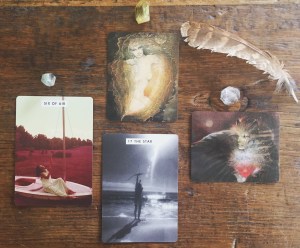 Venus, The Sphinx, Six of Swords, & The Star (Goddess Knowledge cards with art by Susan Seddon Boulet, and Invisible Light Tarot by Brandy Eve Allen)